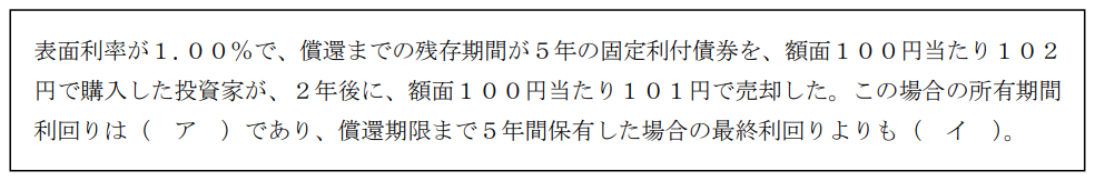 金融資産運用学科2022年9月問23債券投資_債券の利回りとリスクFP2級 2022年9月 学科 問23固定利付債券の利回り(単利・年率)と価格との関係に関する次の記述の空欄(ア)、(イ)にあてはまる語句の組み合わせとして、最も適切なものはどれか。なお、手数料、経過利子、税金等については考慮しないものとし、計算結果は表示単位の小数点以下第3位を四捨五入するものとする。 A(ア) 0.49% (イ)低いB(ア) 0.59% (イ) 高いC(ア) 0.49% (イ) 高いD(ア) 0.59% (イ)低い