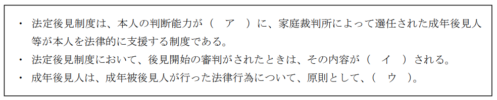 相続・事業承継学科2023年9月問54相続_遺留分・法定相続分FP2級 2023年9月 学科 問54法定後見制度に関する次の記述の空欄(ア)〜(ウ)にあてはまる語句の組み合わせとして、最も適 切なものはどれか。 A被相続人の子が廃除により相続権を失った場合、その者に被相続人の直系卑属である子がいるときは、その子(被相続人の孫) は代襲相続人となる。B被相続人と婚姻の届出をしていないが、被相続人といわゆる内縁関係にあった者は、被相続人の配偶者とみなされて相続人となる。C離婚した元配偶者との間に出生した被相続人の子が当該元配偶者の親権に服している場合、その子は相続人とならない。D特別養子縁組による養子は、実方の父母および養親の相続人となる。