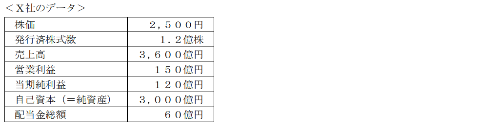 金融資産運用学科2024年9月問25株式投資_株式の基本FP2級 2024年9月 学科 問25下記<X社のデータ>に基づき算出される投資指標に関する次の記述のうち、最も不適切なものはどれか。 A配当利回りは、2%である。BPBRは、1倍である。CROEは、5%である。DPERは、25倍である。
