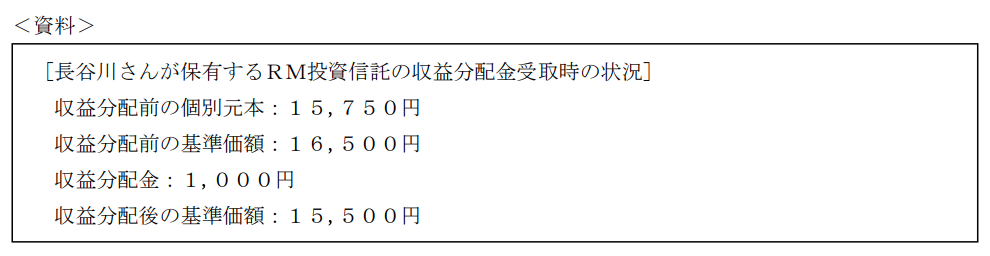 金融資産運用実技2022年5月問5投資信託_収益分配金の課税関係FP2級 2022年5月 実技 問5長谷川さんは、保有しているRM投資信託(追加型国内公募株式投資信託)の収益分配金を2022年2月に受け取った。RM投資信託の運用状況が下記<資料>のとおりである場合、収益分配後の個別元本として、正しいものはどれか。 A15,500円B15,750円C15,000円D16,500円