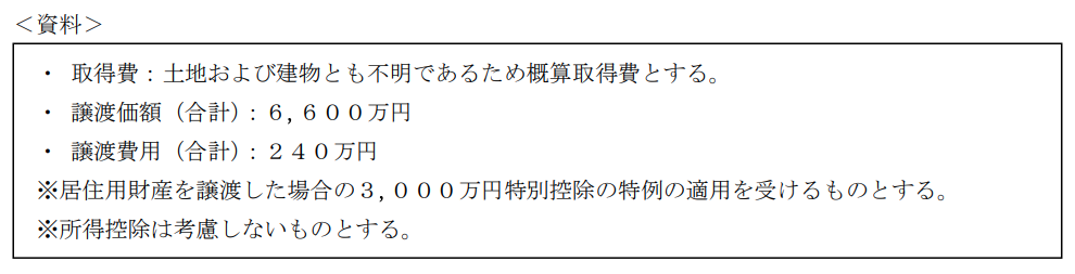不動産実技2022年5月問10税金_譲渡所得FP2級 2022年5月 実技 問10杉山さんは、9年前に相続により取得し、その後継続して居住している自宅の土地および建物の売却を検討している。売却に係る状況が下記<資料>のとおりである場合、所得税における課税長期譲渡所得の金額として、正しいものはどれか。なお、<資料>に記載のない事項は一切考慮しないこととする。 A3,360万円B3,600万円C3,270万円D3,030万円