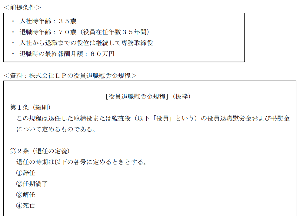 タックスプラン実技2022年5月問13各種所得_退職所得FP2級 2022年5月 実技 問13株式会社LPの専務取締役の関根さんが任期満了で退職した場合、同社の役員退職慰労金規程に基づき受け取ることができる役員退職慰労金の金額を計算しなさい。なお、解答は以下の<前提条件>および<資料>に基づくものとし、記載のない事項については一切考慮しないものとする。 万円回答を入力万円解答する
