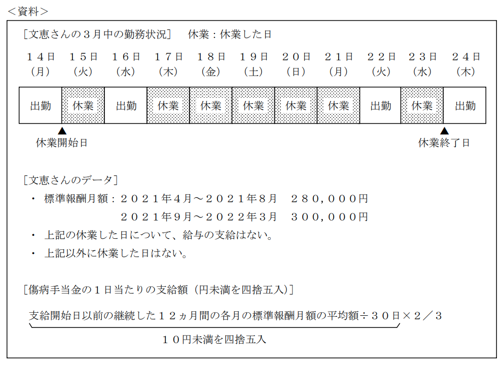 ライフプランニング実技2022年5月問40社会保険_傷病手当金FP2級 2022年5月 実技 問40 文恵さんは、2022年3月中に業務外の事由による病気の療養のため休業した日がある。FPの宮本さんが下記<資料>に基づいて計算した文恵さんに支給される傷病手当金の額として、正しいものはどれか。なお、文恵さんは全国健康保険協会管掌健康保険(協会けんぽ)の被保険者であり、記載以外の受給要件はすべて満たしているものとする。 A12,960円B25,920円C19,440円D45,360円