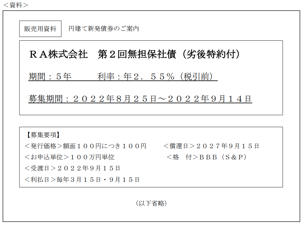金融資産運用実技2022年9月問4債券投資_債券の基本FP2級 2022年9月 実技 問4下記の<資料>に関する次の記述のうち、最も不適切なものはどれか。 Aこの社債は、NISA(少額投資非課税制度)の対象外である。B一般に劣後特約付債券は、発行体の破産手続きなどが行われる場合、普通社債よりも支払い順位が劣る。Cこの社債は、投資適格債である。Dこの社債を新規発行で100万円額面購入する場合、100万円に募集手数料を加えた金額を支払う。