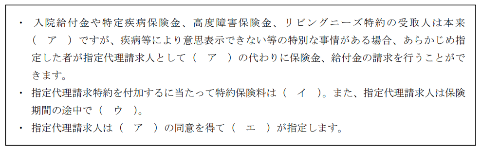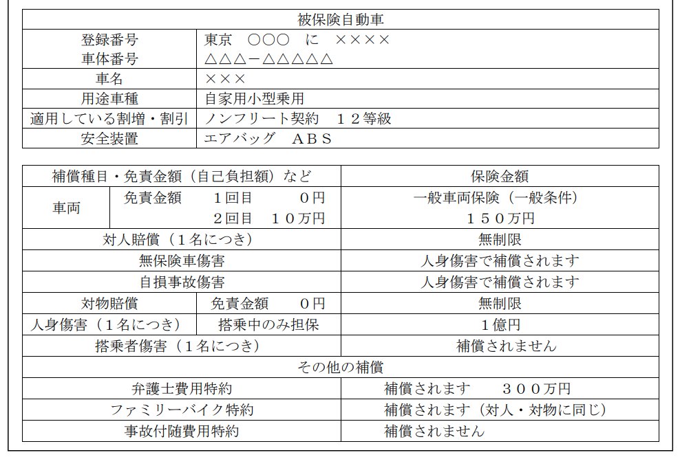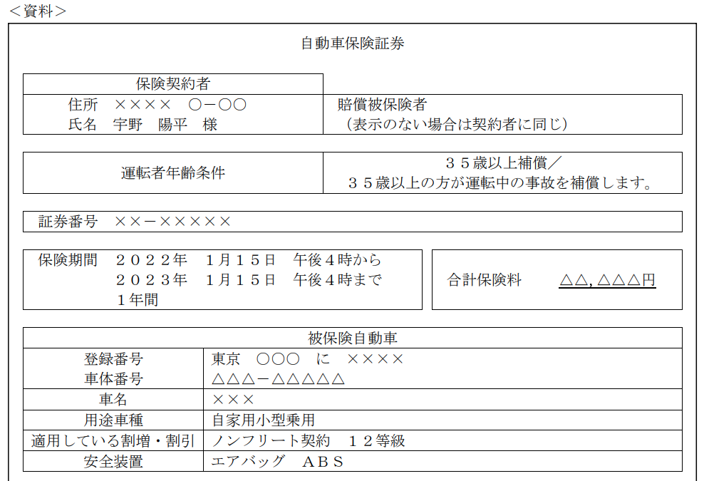 宇野陽平さん(48歳)は、下記<資料>の自動車保険に加入している。下記<資料>に基づき、FPの布施さんが行った次の(ア) - (エ)の説明のうち、適切なものには○、不適切なものには×を解答欄に記入しなさい。なお、<資料>に記載のない特約については考慮しないものとする。