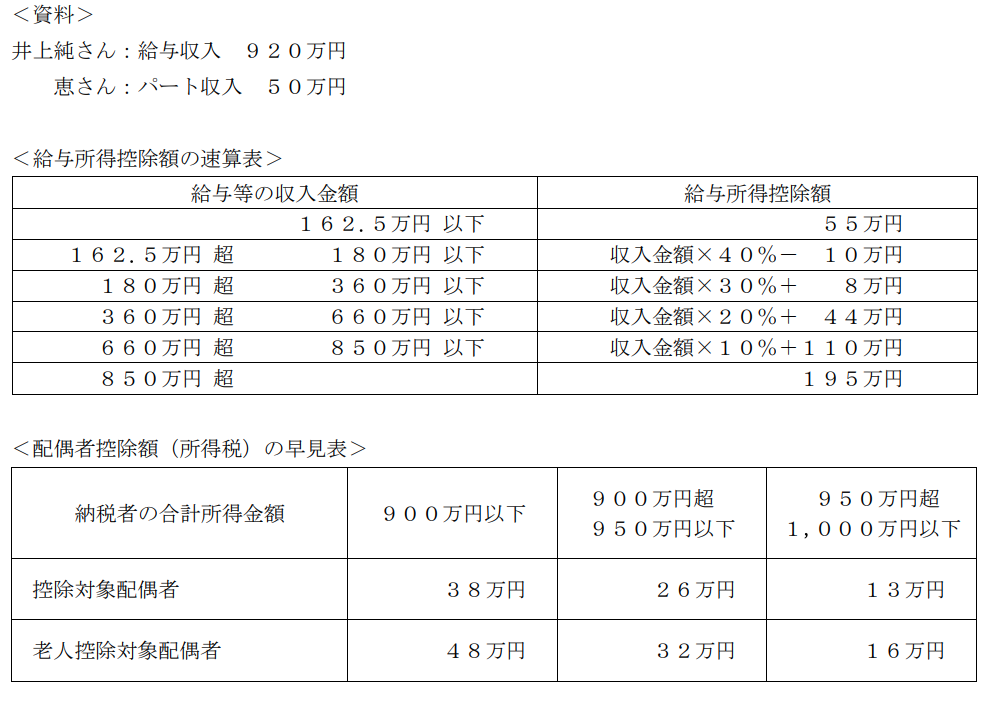 タックスプラン実技2022年9月問16所得控除_配偶者控除・扶養控除FP2級 2022年9月 実技 問16給与所得者の井上純さん(41歳)は、妻の恵さん(40歳)と生計を一にしている。純さんと恵さんの2022年分の所得の状況が下記<資料>のとおりである場合、純さんの所得税の計算上、配偶者控除または配偶者特別控除として控除される金額として、正しいものはどれか。なお、記載されている事項以外については、考慮しないものとする。 A配偶者特別控除 38万円B配偶者控除 26万円C配偶者控除 38万円D配偶者特別控除 26万円