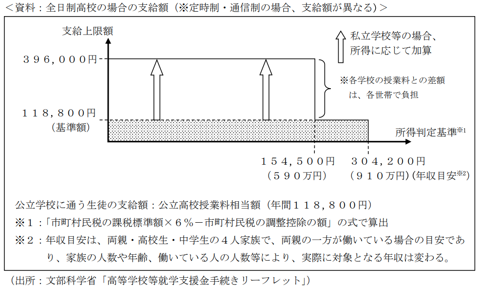 ライフプランニング実技2023年1月問30教育資金計画FP2級 2023年1月 実技 問30 和雄さんは、翔太さんの高校の授業料負担についてFPの岡さんに質問をした。「高等学校等就学支援金制度」に係る下記<資料>に関する岡さんの説明のうち、最も不適切なものはどれか。 A「高校入学時に高等学校等就学支援金の受給資格に該当しない場合、その後在学中に申請はできません。」B「高等学校等就学支援金は、学校設置者が生徒本人に代わって受け取り授業料に充てるしくみのため、生徒や保護者が直接お金を受け取るものではありません。」C「高等学校等就学支援金制度を利用するためには申請が必要で、原則として、保護者等の収入状況を登録する必要があります。」D「所得判定基準が304,200円未満の場合、国公立高校の授業料負担は実質0円になります。」