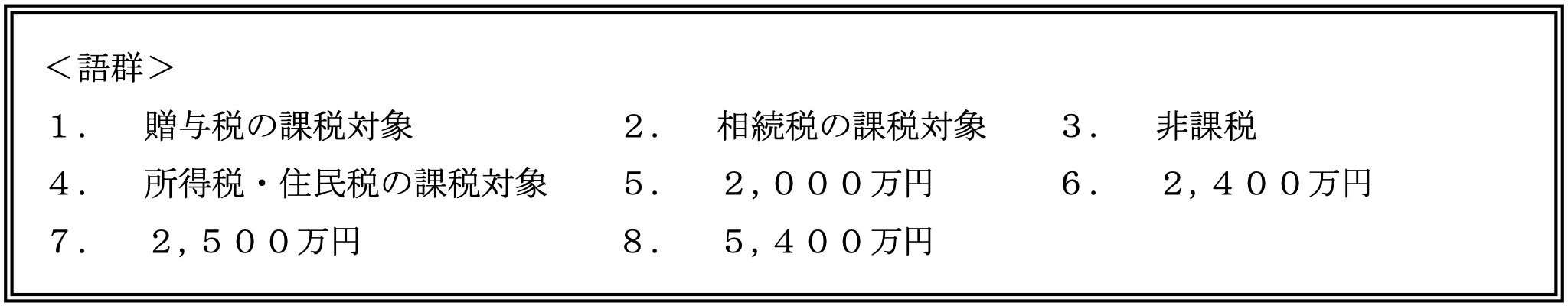 天野三郎さんが契約している生命保険(下記<資料>参照)に関する次の記述の空欄(ア)-(エ)にあてはまる語句を語群の中から選び、その番号のみを解答欄に記入しなさい。なお、同じ番号を何度選んでもよいこととする。また、三郎さんの家族構成は以下のとおりであり、課税対象となる保険金はいずれも基礎控除額を超えているものとする。