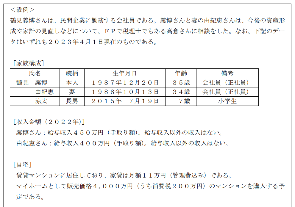 ライフプランニング実技2023年5月問28住宅取得資金計画FP2級 2023年5月 実技 問28 鶴見さん夫妻は、2023年7月にマンションを購入する予定である。鶴見さん夫妻が<設例>のマンションを購入する場合の販売価格のうち、土地(敷地の共有持分)の価格を計算しなさい。なお、消費税の税率は10%とし、計算結果については万円未満の端数が生じる場合は四捨五入すること。また、解答に当たっては、解答用紙に記載されている単位に従うこと。 万円回答を入力万円解答する