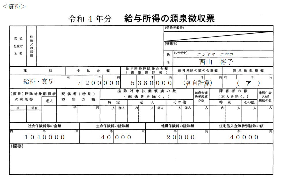 ライフプランニング実技2023年5月問35バランスシートFP2級 2023年5月 実技 問35 FPの駒田さんは、まず2023年4月1日現在における西山裕子さんのバランスシート分析を行うこととした。下表の空欄(ア)に入る数値を計算しなさい。 回答を入力解答する