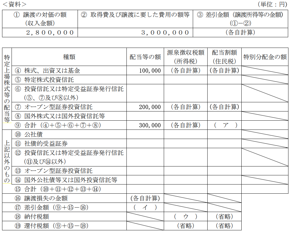 裕子さんが取引をしている国内の証券会社から送付された2022年分の特定口座年間取引報告書(一部)が下記<資料>のとおりである場合、次の記述の空欄(ア) - (ウ)に入る適切な数値を語群の中から選び、その番号のみを解答欄に記入しなさい。なお、同じ番号を何度選択してもよいこととする。また、復興特別所得税については考慮しないこと。