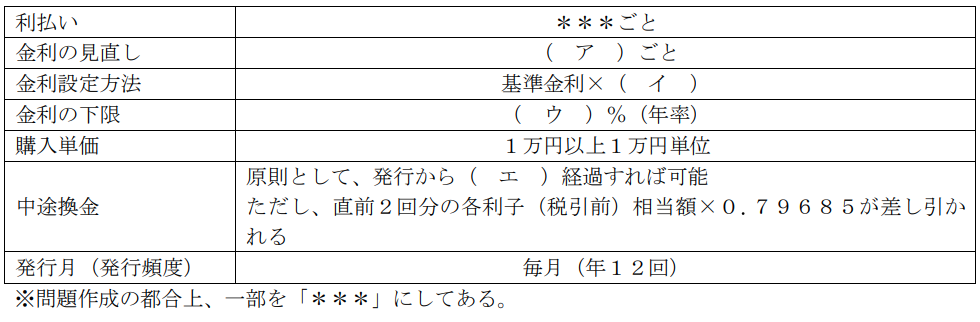 金融資産運用実技2023年9月問4債券投資_債券の基本FP2級 2023年9月 実技 問4個人向け国債(変動10年)に関する下表の空欄(ア) - (エ)にあてはまる適切な語句または数値を語群の中から選び、その番号のみを解答欄に記入しなさい。なお、同じ番号を何度選んでもよいこととする。 (ア)--1. 1年2. 半年3. 3年4. 0.035. 0.056. 0.337. 0.58. 0.559. 0.6610. (イ)--1. 1年2. 半年3. 3年4. 0.035. 0.056. 0.337. 0.58. 0.559. 0.6610. (ウ)--1. 1年2. 半年3. 3年4. 0.035. 0.056. 0.337. 0.58. 0.559. 0.6610. (エ)--1. 1年2. 半年3. 3年4. 0.035. 0.056. 0.337. 0.58. 0.559. 0.6610. 解答する