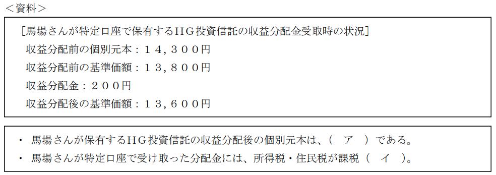 金融資産運用実技2023年9月問5投資信託_収益分配金の課税関係FP2級 2023年9月 実技 問5馬場さんは、特定口座で保有しているHG投資信託(追加型国内公募株式投資信託)の収益分配金を2023年6月に受け取った。HG投資信託の運用状況が下記<資料>のとおりである場合、次の記述の空欄(ア)、(イ)にあてはまる語句の組み合わせとして、最も適切なものはどれか。 A(ア)13,600円 (イ)されないB(ア)14,100円 (イ)されるC(ア)13,600円 (イ)されるD(ア)14,100円 (イ)されない