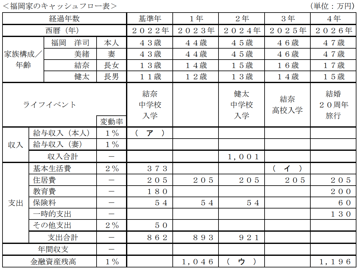 ライフプランニング実技2023年9月問24キャッシュフローFP2級 2023年9月 実技 問24 福岡家のキャッシュフロー表の空欄(ウ)にあてはまる数値を計算しなさい。なお、計算に当たっては、キャッシュフロー表中に記載の整数を使用し、計算結果については万円未満を四捨五入すること。 万円回答を入力万円解答する