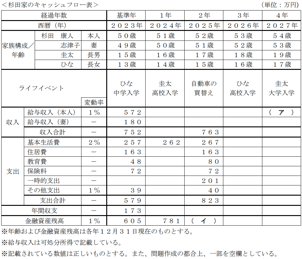 ライフプランニング実技2024年1月問22キャッシュフローFP2級 2024年1月 実技 問22 杉田家のキャッシュフロー表の空欄(ア)にあてはまる数値を計算しなさい。なお、計算過程においては端数処理をせず計算し、計算結果については万円未満を四捨五入すること。回答を入力解答する
