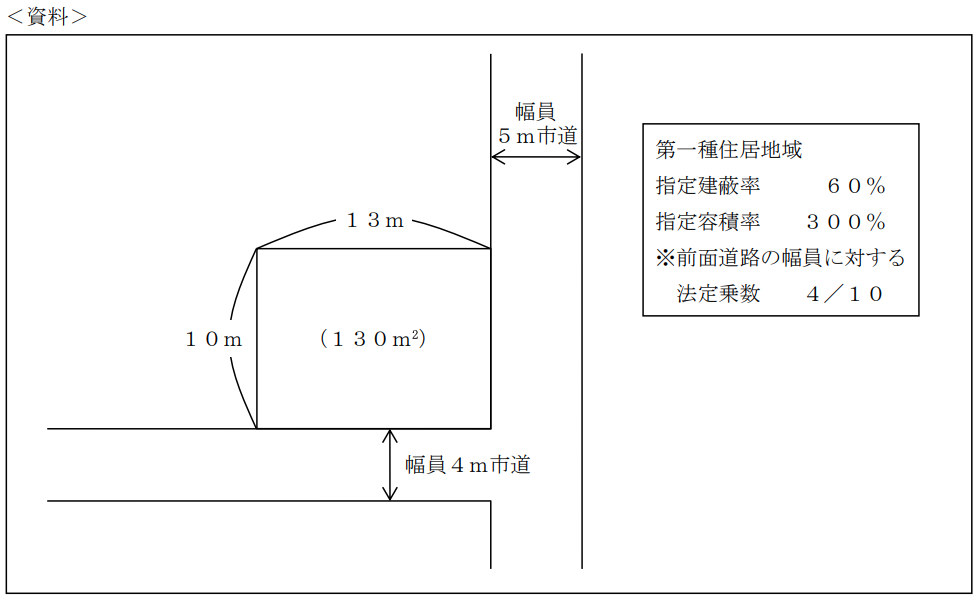 不動産実技2024年5月問7法令上の規制_建築基準法・農地法FP2級 2024年5月 実技 問7建築基準法に従い、下記<資料>の土地に建築物を建てる場合の延べ面積(床面積の合計)の最高限度を計算しなさい。なお、記載のない事項は一切考慮しないものとする。また、解答に当たっては、解答用紙に記載されている単位に従うこと。 m2回答を入力m2解答する