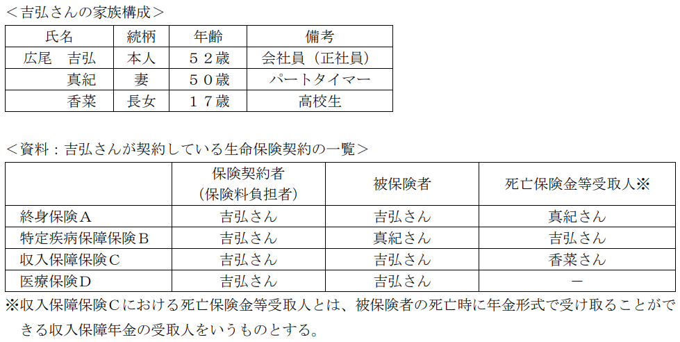 広尾吉弘さんが契約している下記<資料>の生命保険に関する次の(ア) - (エ)の記述について、適切なものには○、不適切なものには×を解答欄に記入しなさい。なお、吉弘さんの家族構成は以下のとおりであり、課税対象となる保険金はいずれも基礎控除額を超えているものとする。