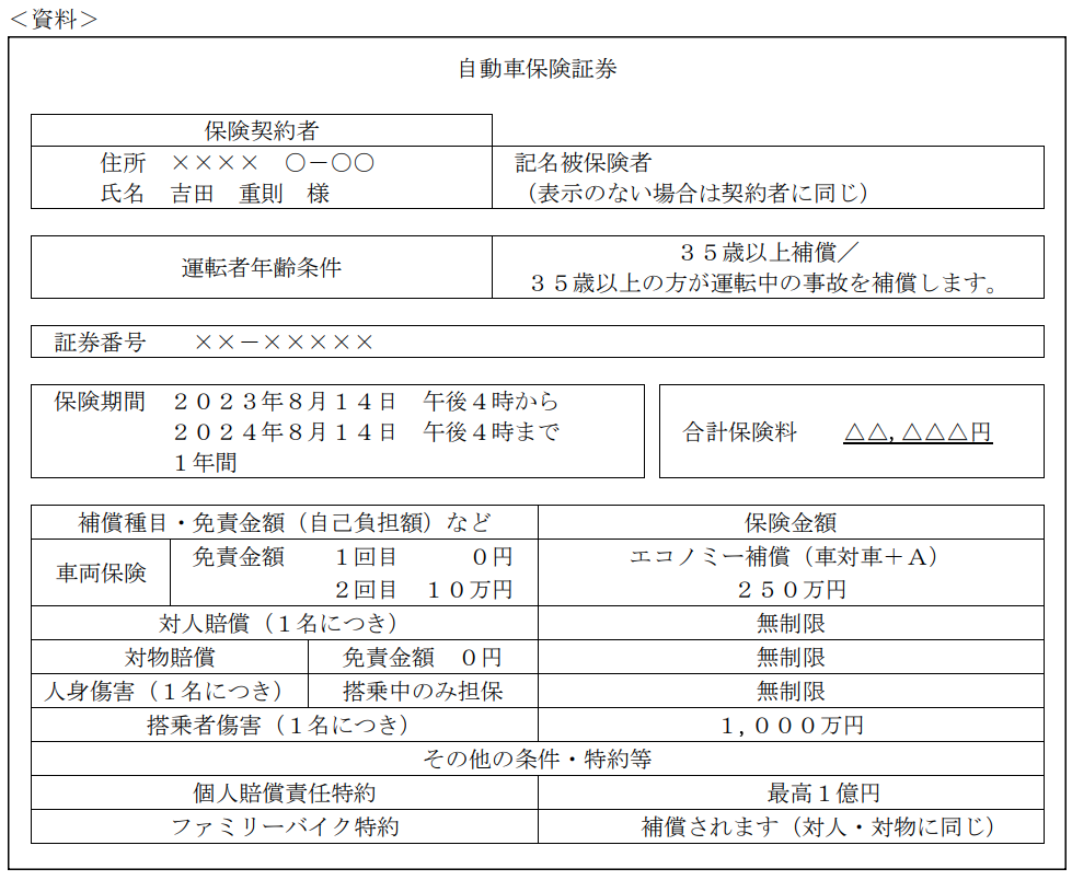 吉田さん(46歳)が自身を記名被保険者として契約している下記<資料>の自動車保険に関するFPの馬場さんが行った次の(ア) - (エ)の説明のうち、適切なものには○、不適切なものには×を解答欄に記入しなさい。なお、<資料>に記載のない特約については考慮しないものとする。