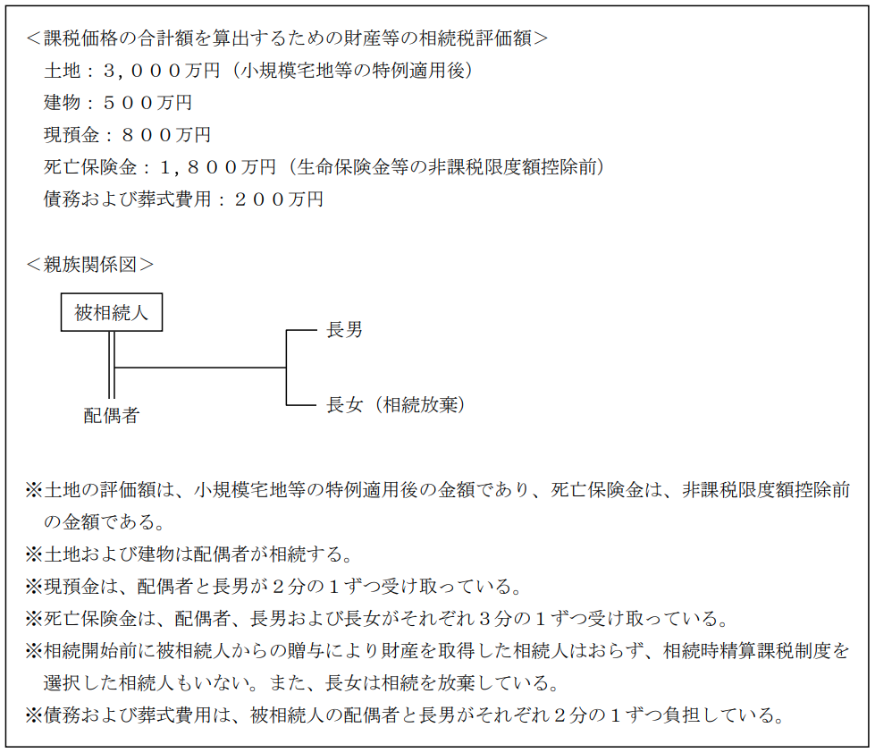 相続・事業承継実技2024年5月問22相続_相続税の加算・控除FP2級 2024年5月 実技 問22下記の相続事例(2023年12月10日相続開始)における各人の相続税の課税価格の組み合わせとして、正しいものはどれか。なお、記載のない事項については一切考慮しないものとする。 A配偶者:3,800万円 長男:300万円 長女:600万円B配偶者:3,900万円 長男:400万円 長女:600万円C配偶者:3,900万円 長男:400万円 長女:100万円D配偶者:4,000万円 長男:500万円 長女:600万円