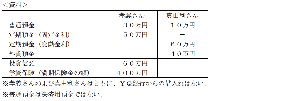 下記<資料>は、小田さん夫婦(孝義さんと真由利さん)の預金保険制度の対象となるYQ銀行の国内支店における金融資産(時価)である。下記<資料>に基づくYQ銀行が破綻した場合の預金保険制度によって保護される金融資産の額に関する次の記述の空欄(ア)、(イ)にあてはまる数値を解答欄に記入しなさい。なお、預金の利息等の記載のない事項については一切考慮しないものとする。
