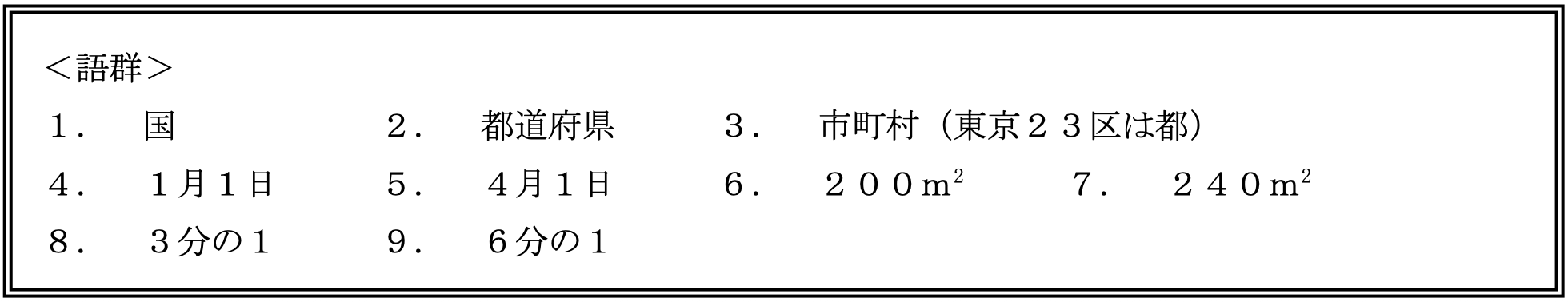 鶴見さんは、FPで税理士でもある榎田さんに不動産に係る固定資産税について質問をした。下記の空欄(ア)-(エ)にあてはまる適切な語句を語群の中から選び、その番号のみを解答欄に記入しなさい。なお、同じ番号を何度選んでもよいものとする。