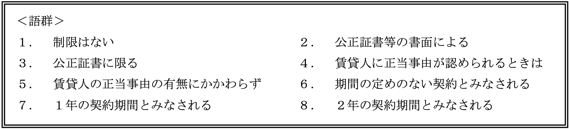 不動産実技2024年9月問10不動産の取引_借地借家法FP2級 2024年9月 実技 問10米田さんは、相続により取得した家を賃貸するに当たり、FPの目黒さんに借家契約の説明を受けた。借地借家法に基づく借家契約に関する下表の空欄(ア)-(エ)にあてはまる適切な語句を語群の中から選び、その番号のみを解答欄に記入しなさい。なお、同じ番号を何度選んでもよいものとする。 (ア)選択 (イ)選択 (ウ)選択 (エ)選択解答する