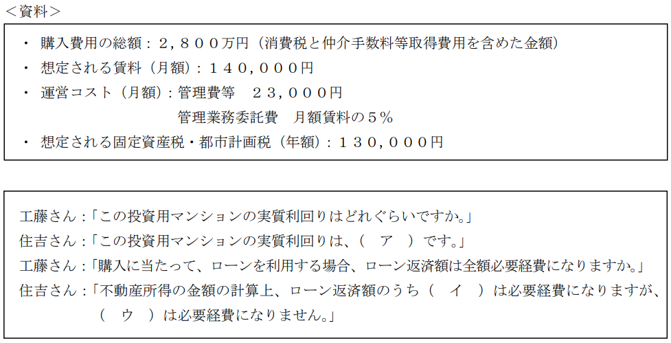 不動産実技2024年9月問11有効活用_純利回り(NOI利回り)FP2級 2024年9月 実技 問11工藤さんは、下記<資料>の投資用マンションについて購入を検討しており、FPの住吉さんに質問をした。下記<資料>に基づく次の記述の空欄(ア) - (ウ)にあてはまる語句の組み合わせとして、最も適切なものはどれか。なお、記載のない事項については一切考慮しないものとし、計算結果について、小数点以下の端数が生じた場合は小数点以下第3位を四捨五入すること。 A(ア)4.25% (イ)利息部分 (ウ)元金部分B(ア)4.25% (イ)元金部分 (ウ)利息部分C(ア)4.71% (イ)元金部分 (ウ)利息部分D(ア)4.71% (イ)利息部分 (ウ)元金部分