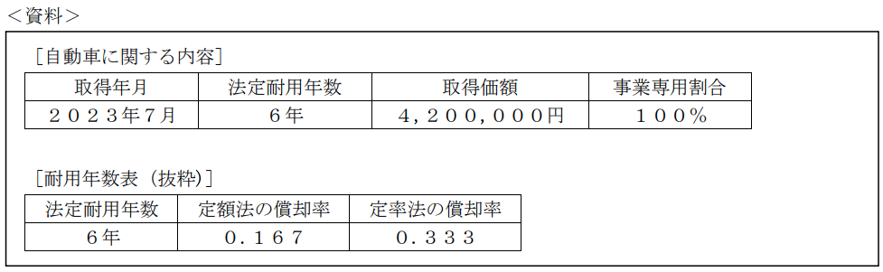 雑貨店を営む個人事業主の池谷さんは、2023年7月に自動車(新車)を購入し、その日から事業の用に供している。購入した自動車に関する内容等が下記<資料>のとおりである場合、下記<資料>に基づく池谷さんの2024年分の所得税における事業所得の金額の計算上、必要経費に算入すべき減価償却費の金額として、正しいものはどれか。なお、池谷さんは個人事業の開業年分(2022年)において、車両の減価償却方法として定率法を選定しており、この自動車を2024年12月末まで引き続き事業の用に供するものとする。また、償却保証額は考慮しないものとし、計算過程および計算結果において、円未満の端数が生じる場合は切り上げること。