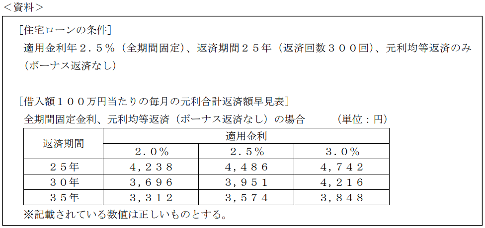 安西さん夫婦はマンション購入に当たり、住宅ローンの年間元利合計返済額を世帯の手取り年収の20%以内に抑えたいと考えている。下記<資料>に基づき、住宅ローンの借入可能額を計算しなさい。なお、記載のない事項については一切考慮しないものとし、計算に当たっては、毎月の返済額は円未満を切り捨て、計算結果は万円未満を切り捨てること。また、解答に当たっては、解答用紙に記載されている単位に従うこと。