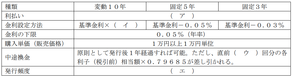 金融資産運用実技2025年1月問6債券投資_債券の基本FP2級 2025年1月 実技 問6個人向け国債に関する下表の空欄(ア) - (エ)にあてはまる適切な語句または数値を語群の中から選び、その番号のみを解答欄に記入しなさい。なお、同じ番号を何度選んでもよいものとする。 (ア)--1. 半年ごと(年2回)2. 毎月(年12回)3. 0.334. 0.555. 0.666. 27. 38. 49. (イ)--1. 半年ごと(年2回)2. 毎月(年12回)3. 0.334. 0.555. 0.666. 27. 38. 49. (ウ)--1. 半年ごと(年2回)2. 毎月(年12回)3. 0.334. 0.555. 0.666. 27. 38. 49. (エ)--1. 半年ごと(年2回)2. 毎月(年12回)3. 0.334. 0.555. 0.666. 27. 38. 49. 解答する