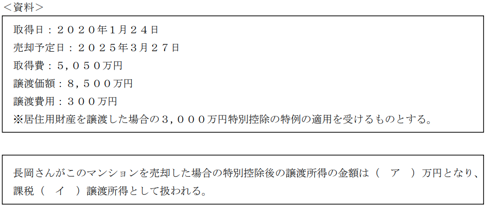 不動産実技2025年1月問10税金_譲渡所得FP2級 2025年1月 実技 問10長岡さんは、居住している自宅マンションを売却する予定である。売却に係る状況が下記<資料>のとおりである場合、所得税に関する次の記述の空欄(ア)、(イ)にあてはまる数値および語句の組み合わせとして、最も適切なものはどれか。なお、記載のない事項については一切考慮しないものとする。 A(ア)150 (イ)長期B(ア)450 (イ)短期C(ア)450 (イ)長期D(ア)150 (イ)短期