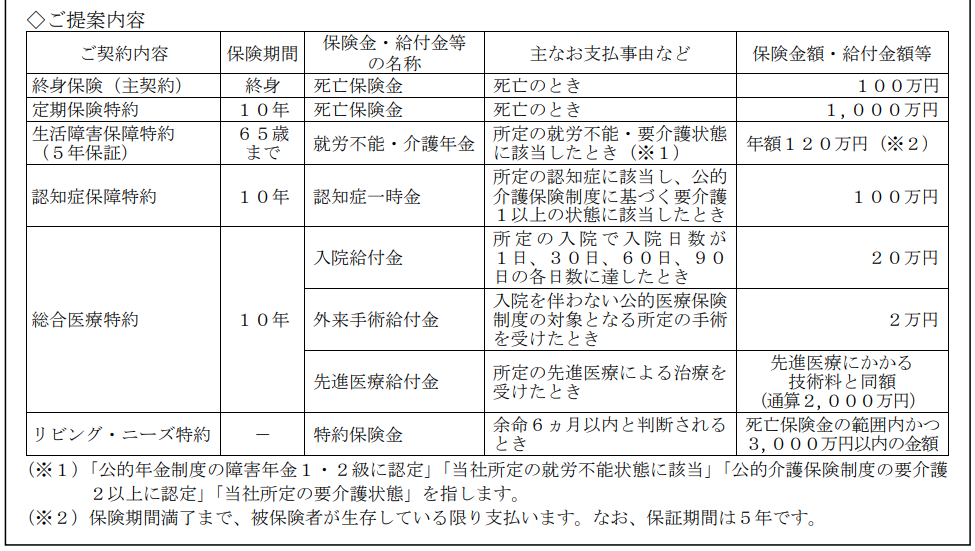 ・ 山本さんが45歳の時に、初老期における認知症(公的介護保険制度における特定疾病に該当する約款所定の認知症)により、公的介護保険制度における要介護2と認定された場合、保険会社から支払われる保険金・給付金等の合計は万円である。なお、特約の保険期間満了まで山本さんは生存しているものとする。