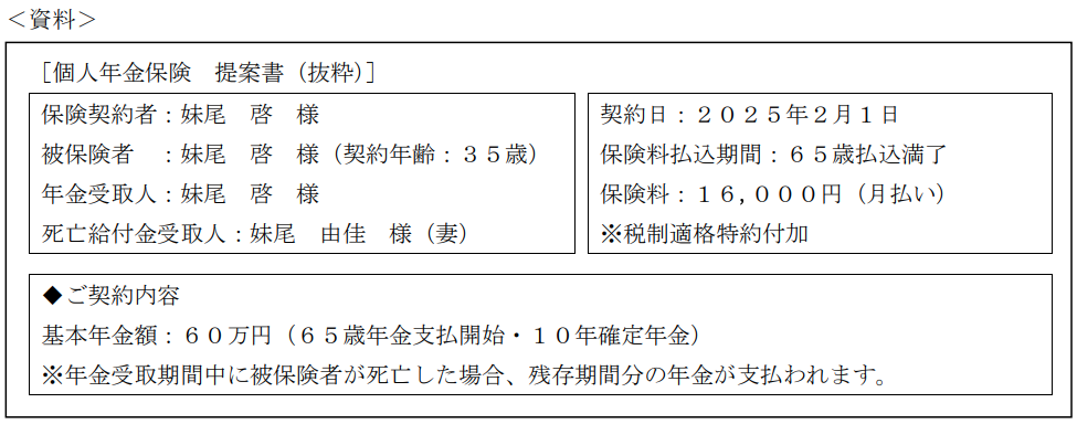 山本誠一さん(37歳)が加入の提案を受けた生命保険の保障内容は下記<資料>のとおりである。この生命保険に加入した場合、次の記述の空欄(ア) - (ウ)にあてはまる数値を解答欄に記入しなさい。なお、各々の記述はそれぞれ独立した問題であり、相互に影響を与えないものとする。