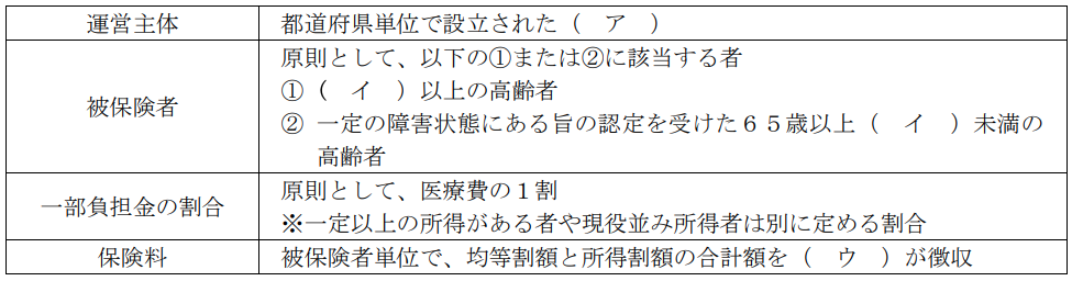 ライフプランニング実技2025年1月問40社会保険_公的医療保険・介護保険FP2級 2025年1月 実技 問40 照之さんは、老後の健康について不安を感じており、高齢者が加入する医療制度の仕組みについて、FPの最上さんに質問をした。後期高齢者医療制度の概要に関する下表の空欄(ア) - (ウ)にあてはまる適切な語句を語群の中から選び、その番号のみを解答欄に記入しなさい。なお、同じ番号を何度選んでもよいものとする。 (ア)--1. 全国健康保険協会(協会けんぽ)都道府県支部2. 国民健康保険団体連合会3. 後期高齢者医療広域連合4. 70歳5. 75歳6. 80歳7. 国8. 都道府県9. 市町村および特別区 (イ)--1. 全国健康保険協会(協会けんぽ)都道府県支部2. 国民健康保険団体連合会3. 後期高齢者医療広域連合4. 70歳5. 75歳6. 80歳7. 国8. 都道府県9. 市町村および特別区 (ウ)--1. 全国健康保険協会(協会けんぽ)都道府県支部2. 国民健康保険団体連合会3. 後期高齢者医療広域連合4. 70歳5. 75歳6. 80歳7. 国8. 都道府県9. 市町村および特別区解答する