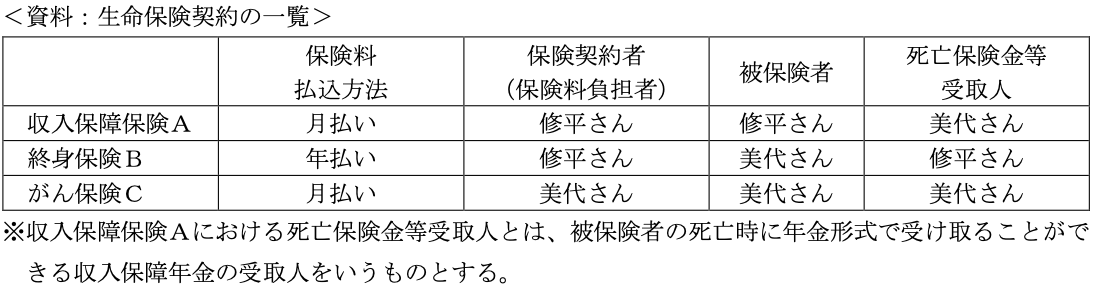 リスク管理実技2025年5月問14生命保険_税金FP2級 2025年5月 実技 問14小川修平さんと妻の美代さんが契約している下記<資料>の生命保険契約について、保険金等が支払われた場合の課税に関する次の記述のうち、最も不適切なものはどれか。 A収入保障保険Aについて、美代さんが受け取る収入保障年金は、年金形式での受取りに代えて一時金での受取りを選択した場合、相続税の課税対象となる。B終身保険Bについて、修平さんが受け取る死亡保険金は、一時所得として所得税の課税対象となる。Cがん保険Cについて、美代さんが受け取るがん診断給付金は、一時所得として所得税の課税対象となる。D収入保障保険Aについて、美代さんが受け取る収入保障年金は、修平さんの死亡時に年金受給権として相続税の課税対象となり、受け取る年金は2年目以降において非課税部分と課税部分に分かれ、課税部分は所得税 (雑所得) および住民税の課税対象となる。