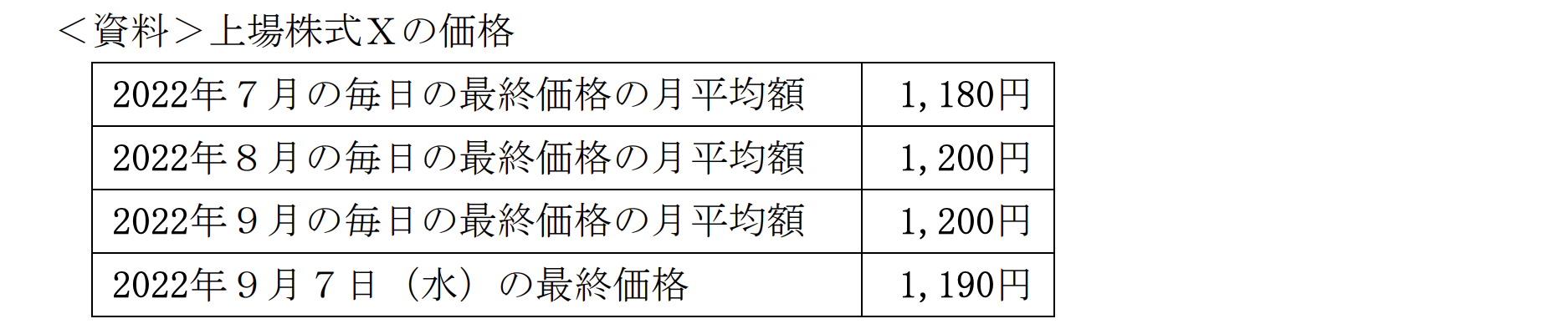 相続・事業承継学科2022年9月問60財産評価_不動産以外FP3級 2022年9月 学科 問60( )内にあてはまる最も適切な文章、語句、数字またはそれらの組合せを選択してください。2022年9月7日(水)に死亡したAさんが所有していた上場株式Xを相続により取得した場合の1株当たりの相続税評価額は、下記の<資料>によれば、( )である。 A1,180円B1,200円C1,190円