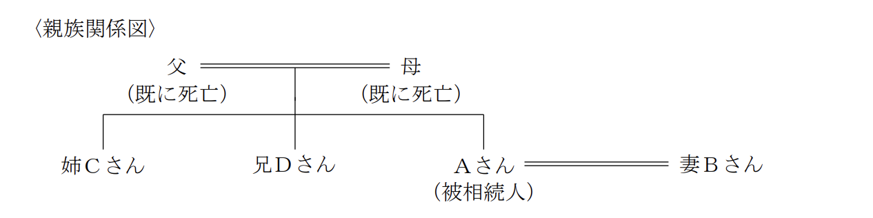 相続・事業承継学科2024年1月問58相続_遺留分・法定相続分FP3級 2024年1月 学科 問58( )内にあてはまる最も適切な文章、語句、数字またはそれらの組合せを選択してください。下記の〈親族関係図〉において、Aさんの相続における妻Bさんの法定相続分は、( )である。なお、Aさんの父母は、Aさんの相続開始前に死亡している。 A3分の2B2分の1C4分の3