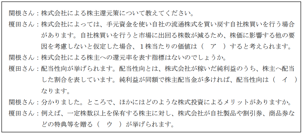 金融資産運用実技2022年1月問4株式投資_株式の基本FP3級 2022年1月 実技 問4関根さんは上場株式への投資に興味をもち、FPの榎田さんに質問をした。下記の空欄(ア)〜(ウ)にあてはまる語句に関する次の記述のうち、最も不適切なものはどれか。 A空欄(ア)にあてはまる語句は、「減少」である。B空欄(ウ)にあてはまる語句は、「株主優待制度」である。C空欄(イ)にあてはまる語句は、「高く」である。