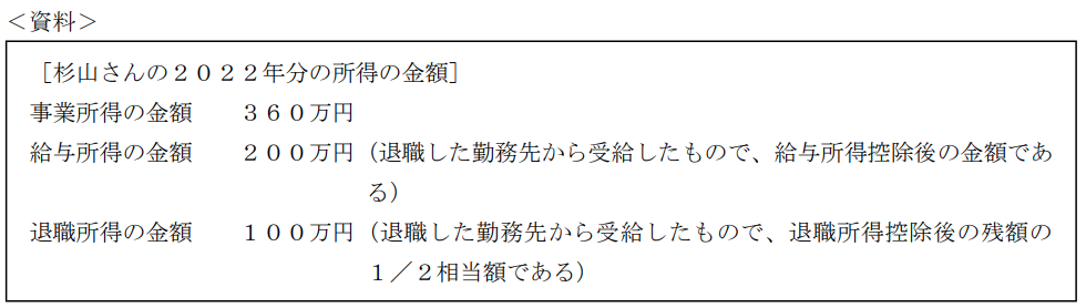 タックスプラン実技2022年9月問12各種所得_退職所得FP3級 2022年9月 実技 問12杉山さんは2022年中に勤務先を退職し、個人事業主として美容室を始めた。杉山さんの2022年分の各種所得の金額が下記<資料>のとおりである場合、杉山さんの2022年分の所得税における総所得金額として正しいものはどれか。なお、杉山さんの2022年中の所得は<資料>に記載されている所得以外にはないものとする。 A660万円B460万円C560万円