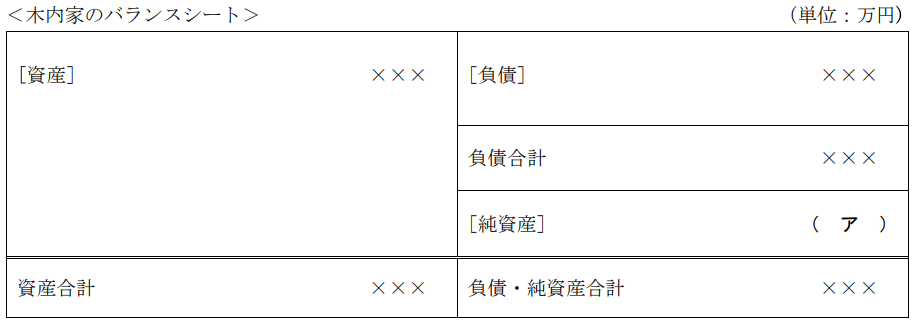 ライフプランニング実技2023年1月問15バランスシートFP3級 2023年1月 実技 問15<設例> 木内智洋さんは株式会社QAに勤める会社員である。智洋さんは、今後の生活設計についてFPで税理士でもある近藤さんに相談をした。なお、下記のデータはいずれも2023年1月1日現在のものである。 FPの近藤さんは、木内家のバランスシートを作成した。下表の空欄(ア)にあてはまる金額として、正しいものはどれか。なお、<設例>に記載のあるデータに基づいて解答することとする。 A4,150(万円)B1,250(万円)C4,100(万円)