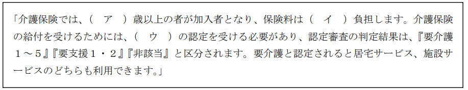 智洋さんは、今後高齢の親の介護が必要になった場合を考え、公的介護保険制度について、FPの近藤さんに質問をした。近藤さんが行った介護保険に関する次の説明の空欄(ア)〜(ウ)にあてはまる数値または語句の組み合わせとして、最も適切なものはどれか。