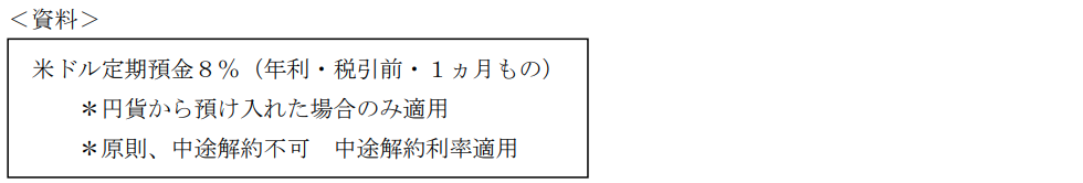 金融資産運用実技2023年1月問20金融商品_外貨建て商品・為替レートFP3級 2023年1月 実技 問20<設例> 木内智洋さんは株式会社QAに勤める会社員である。智洋さんは、今後の生活設計についてFPで税理士でもある近藤さんに相談をした。なお、下記のデータはいずれも2023年1月1日現在のものである。 智洋さんは、下記<資料>の外貨定期預金キャンペーンに関心を持っている。預入条件が<資料>のとおりであるとき、FPの近藤さんの次の説明のうち、最も不適切なものはどれか。 A「円貨から外貨定期預金を始める際は、TTSレート(対顧客電信売相場)が適用されます。B「元金1万ドルを預けた場合、満期時には税引前・米ドルベースで800ドルの利息を受け取ることができます。」C「外貨預金は預金保険制度の対象外となっています。」