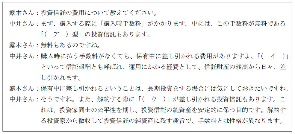 金融資産運用実技2023年5月問3投資信託_ポートフォリオ理論・デリバティブFP3級 2023年5月 実技 問3露木さんは、投資信託の費用についてFPの中井さんに質問をした。下記の空欄(ア)〜(ウ)にあてはまる語句に関する次の記述のうち、最も適切なものはどれか。 A(イ)にあてはまる語句は、「口座管理料」である。B(ア)にあてはまる語句は、「オープン」である。C(ウ)にあてはまる語句は、「信託財産留保額」である。