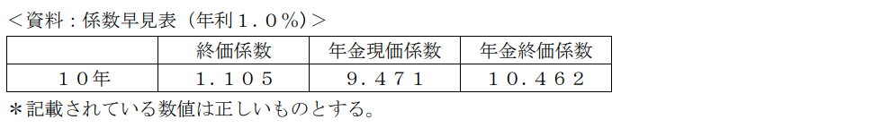 恭平さんと亜美さんは、今後10年間で毎年24万円ずつ積立貯蓄をして、潤さんの教育資金を準備したいと考えている。積立期間中に年利1.0%で複利運用できるものとした場合、10年後の積立金額として、正しいものはどれか。なお、下記<資料>の3つの係数の中から最も適切な係数を選択して計算し、解答に当たっては万円未満を切り捨てること。また、税金や記載のない事項については一切考慮しないこととする。