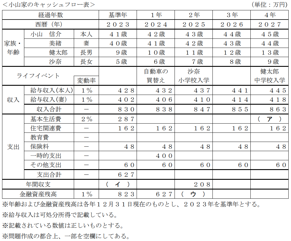ライフプランニング実技2023年9月問2キャッシュフローFP3級 2023年9月 実技 問2下記は、小山家のキャッシュフロー表(一部抜粋)である。このキャッシュフロー表の空欄(ア)〜(ウ)にあてはまる数値として、誤っているものはどれか。なお、計算過程においては端数処理をせず計算し、計算結果については万円未満を四捨五入すること。 A(イ)203B(ウ)841C(ア)310