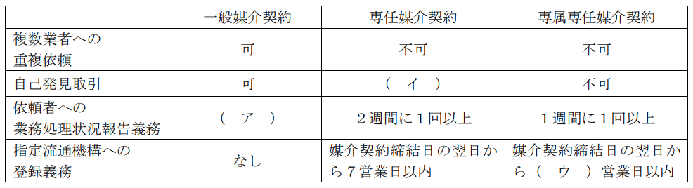 不動産実技2023年9月問7不動産の取引_不動産に係る契約FP3級 2023年9月 実技 問7下表は、宅地建物の売買・交換において、宅地建物取引業者と交わす媒介契約の種類とその概要についてまとめた表である。下表の空欄(ア)〜(ウ)にあてはまる語句または数値の組み合わせとして、最も適切なものはどれか。なお、自己発見取引とは、自ら発見した相手方と売買または交換の契約を締結する行為を指すものとする。 A(ア)3週間に1回以上 (イ)不可 (ウ)5B(ア)なし (イ)可 (ウ)5C(ア)3週間に1回以上 (イ)可 (ウ)3