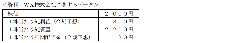金融資産運用実技2024年1月問3株式投資_投資の指標FP3級 2024年1月 実技 問3下記<資料>に基づくWX株式会社の投資指標に関する次の記述のうち、最も適切なものはどれか。 なお、記載のない事項は一切考慮しないものとし、計算結果については表示単位の小数点以下第3位を四捨五入すること。 A配当性向は、10%である。B配当利回りは、1.36%である。C株価純資産倍率(PBR)は、1.1倍である。