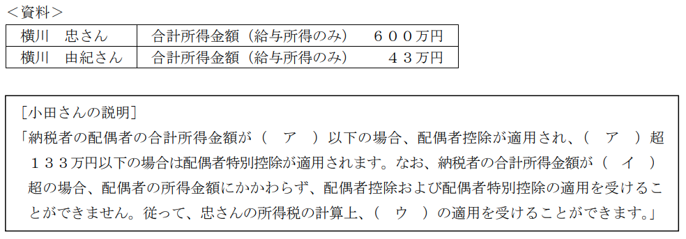 給与所得者の横川忠さん(50歳)は、生計を一にしている妻の由紀さん(48歳)に係る配偶者控除または配偶者特別控除について、FPで税理士でもある小田さんに質問をした。忠さんと由紀さんの2023年分の所得等の状況が下記<資料>のとおりである場合、小田さんが行った次の説明の空欄(ア)〜(ウ)にあてはまる語句の組み合わせとして、最も適切なものはどれか。なお、記載のない事項については一切考慮しないものとする。