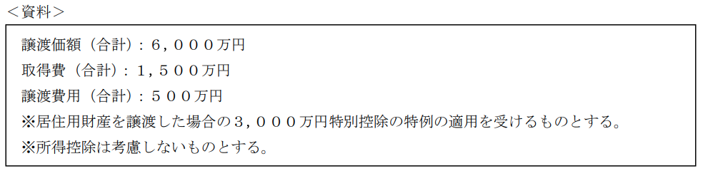 不動産実技2024年1月問14税金_譲渡所得FP3級 2024年1月 実技 問14野村さんは、15年前に購入し、現在居住している自宅の土地および建物を売却する予定である。売却に係る状況が下記<資料>のとおりである場合、所得税における課税長期譲渡所得の金額として、正しいものはどれか。なお、記載のない事項については一切考慮しないものとする。 A1,500万円B4,000万円C1,000万円