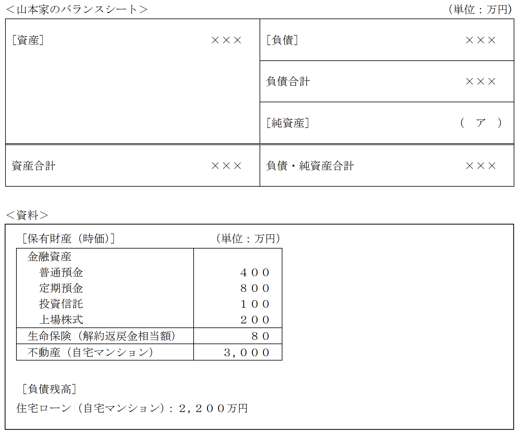 ライフプランニング実技2024年5月問3バランスシートFP3級 2024年5月 実技 問3山本家の現時点の資産および負債が下記<資料>のとおりである場合、<資料>に基づく山本家のバランスシートの空欄(ア)にあてはまる金額として、正しいものはどれか。なお、記載のない事項については一切考慮しないこととする。 A1,580(万円)B2,380(万円)C2,300(万円)